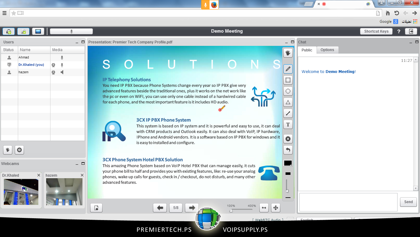 Web Conferencing System is a system for on-line learning,enables you to share documents (PDF and any office document), webcams, chat, audio and your desktop. It can also record sessions for later playback.